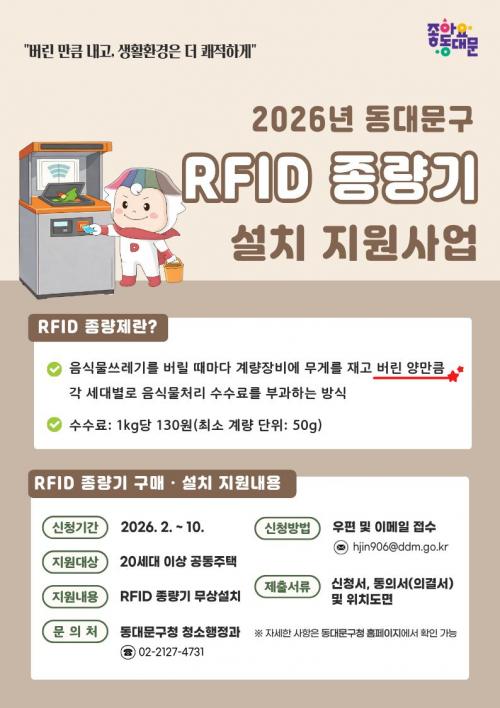[½Åµ¿¾Æ¹æ¼Û µ¿´ë¹®±¸=À̽ŵ¿±âÀÚ] µ¿´ë¹®±¸´Â À½½Ä¹°·ù Æó±â¹°À» ÁÙÀ̰í ÄèÀûÇÑ ÁÖ°Åȯ°æÀ» ¸¸µé±â À§ÇØ ¡®2026³â °øµ¿ÁÖÅà À½½Ä¹° ¾²·¹±â RFID Á¾·®±â ¼³Ä¡ Áö¿ø »ç¾÷¡¯À» È®´ë ÃßÁøÇÑ´Ù. ±¸´Â °¢ ¼¼´ë°¡ ¹ö¸° À½½Ä¹° ¾²·¹±â ¾ç¸¸Å­ ¼ö¼ö·á¸¦ ³»´Â RFID Á¾·®Á¦¸¦ ¿î¡¦