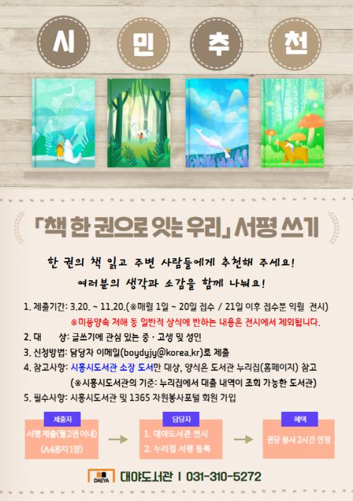 [½Åµ¿¾Æ¹æ¼Û ½ÃÈï½Ã=À̽ŵ¿±âÀÚ] ½ÃÈï½Ã ´ë¾ßµµ¼­°üÀº ½Ã¹Î µ¶¼­ ¹®È­ È®»ê°ú Áö¿ª»çȸ µ¶¼­°øµ¿Ã¼ Ȱ¼ºÈ­¸¦ À§ÇØ 3¿ù 20ÀϺÎÅÍ 11¿ù 20ÀϱîÁö ¼­Æò ¾²±â¸¦ ¿î¿µÇÏ´Â °¡¿îµ¥ ½Ã¹ÎµéÀÇ ¼­ÆòÀ» ¹Þ´Â´Ù. À̹ø ¼­Æò ¾²±â´Â ½ÃÈï½Ãµµ¼­°üÀÇ ¼ÒÀå µµ¼­¸¦ ÀÐ°í ´À³¤ Á¡°ú Ãß¡¦