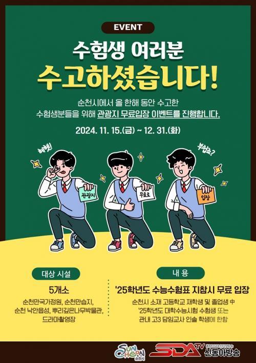 ¹«·á·Î °³¹æµÇ´Â °ü±¤Áö´Â ¼øÃµ¸¸±¹°¡Á¤¿ø, ¼øÃµ¸¸½ÀÁö, ¼øÃµ ³«¾ÈÀ¾¼º, »Ñ¸®±íÀº³ª¹«¹Ú¹°°ü, µå¶ó¸¶ÃÔ¿µÀåÀ¸·Î ¼øÃµÀ» ´ëÇ¥ÇÏ´Â 5°³ ¸í¼Ò´Ù. ÀÌµé °ü±¤Áö´Â ´Ù¾çÇÑ ÀÚ¿¬°ú ¹®ÈÀû Ư»öÀ» Áö´Ñ Àå¼Ò·Î, ¼öÇè»ýµéÀÌ Àϻ󿡼 ¹þ¾î³ª »õ·Î¿î °æÇèÀ» ½×À» ¼ö ÀÖ´Â ±âȸ¸¦ Á¦°øÇÑ´Ù.