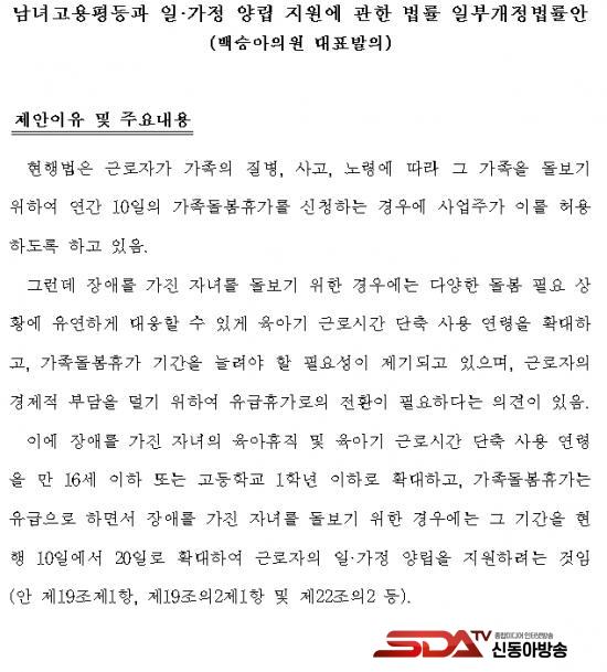 ¡à ´õºÒ¾î¹ÎÁÖ´ç ¹é½Â¾Æ ÀÇ¿ø(±¹È¸ ±³À°À§¿øÈ¸)ÀÌ ´ëÇ¥ ¹ßÀÇÇÑ ¡¸³²³à°í¿ëÆòµî°ú ÀÏ¡¤°¡Á¤ ¾ç¸³ Áö¿ø¿¡ °üÇÑ ¹ý·ü ÀϺΰ³Á¤ ¹ý·ü¾È¡¹¿¡ µû¸£¸é ¡ãÀå¾Ö¸¦ °¡Áø ÀÚ³àÀÇ ºÎ¸ð¿¡ ´ëÇÑ À°¾ÆÈÞÁ÷ ¹× À°¾Æ±â ±Ù·Î½Ã°£ ´ÜÃà »ç¿ë ¿¬·ÉÀ» ÇöÇà Àå¾Ö¿©ºÎ¿Í »ó°ü¾øÀÌ ¸¸ 8¼¼ ÀÌÇÏ ¶Ç´Â ÃʵîÇб³ 2Çгâ ÀÌÇÏ¿¡¼ ¸¸ 16¼¼ ÀÌÇÏ ¶Ç´Â °íµîÇб³ 1Çгâ ÀÌÇÏ·Î È®´ëÇÏ°í ¡ã°¡Á·µ¹º½ÈÞ°¡ À¯±Þ Àüȯ ¹× ±× ±â°£À» ÇöÇà 10ÀÏ¿¡¼ 20ÀÏ·Î È®´ëÇÏ´Â ³»¿ëÀÌ´Ù.