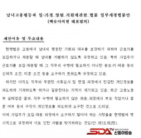 ¡à ±¹È¸ ±³À°À§¿øÈ¸¡¤¿©¼º°¡Á·À§¿øÈ¸ ¼Ò¼Ó ¹é½Â¾Æ ÀÇ¿ø(´õºÒ¾î¹ÎÁÖ´ç)ÀÌ ´ëÇ¥¹ßÀÇÇÑ ¡¸³²³à°í¿ëÆòµî°ú ÀÏ¡¤°¡Á¤ ¾ç¸³ Áö¿ø¿¡ °üÇÑ ¹ý·ü °³Á¤¾È¡¹Àº ¡ã¿ë¸ð¡¤Å°¡¤Ã¼Áß µîÀÇ ½ÅüÀû Á¶°Ç ¡ãÈ¥ÀÎ ¿©ºÎ¡¤Àӽš¤Ãâ»ê µî¿¡ °üÇÑ Á¶°Ç ¡ãÃâ½ÅÁö¿ª¡¤Àç»ê µî¿¡ °üÇÑ Á¶°Ç ¡ãÁ÷°èÁ¸ºñ¼Ó ¹× ÇüÁ¦ÀÚ¸ÅÀÇ Çз¡¤Á÷¾÷¡¤Àç»ê µî¿¡ °üÇÑ Á¶°Ç µî »ç¾÷ÁÖ°¡ ±Ù·ÎÀÚ Ã¤¿ë¡¤¸ðÁý °úÁ¤¿¡¼ ¿ä±¸ÇÏÁö ¸»¾Æ¾ß ÇÏ´Â »çÇ×À» ¸í½ÃÀûÀ¸·Î ±ÔÁ¤ÇÏ´Â ³»¿ëÀÌ´Ù.