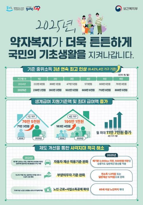 ±âÃÊ»ýȰº¸ÀåÁ¦µµ¿¡¼ °¡±¸ÀÇ ¼Òµæ ÀÎÁ¤¾×ÀÌ ±âÁØ(2025³â 1ÀÎ ±âÁØ »ý°è±Þ¿© 76¸¸ 5,444¿ø, ÀÇ·á±Þ¿© 95¸¸ 6,805¿ø, Áְű޿© 114¸¸ 8,166¿ø, ±³À°±Þ¿© 119¸¸ 6,007¿ø) ÀÌÇÏÀÏ °æ¿ì ¼ö±ÞÀÚ·Î ¼±Á¤µÉ ¼ö ÀÖ´Ù.