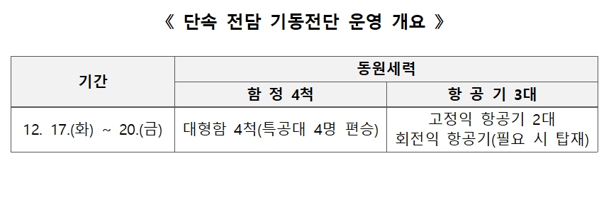 ÀÌ¿¡, ÇØ¾ç°æÂûûÀº ¿ì¸® ¾î¹ÎÀÇ »ý¾÷À» º¸ÀåÇϰí, ¿Ü±¹¾î¼±ÀÇ ºÒ¹ýÁ¶¾÷ ½Ãµµ¸¦ Â÷´ÜÇϱâ À§ÇØ ´ëÇüÇÔ 4ô°ú Ç×°ø±â, Ư°ø´ë µîÀ¸·Î ±¸¼ºµÈ ¡°ºÒ¹ýÁ¶¾÷ ´Ü¼ÓÀü´ã ±âµ¿Àü´Ü¡±À» ¿î¿µÇÏ¿©, ¼±Á¦ÀûÀ¸·Î ´Ü¼ÓȰµ¿À» Àü°³ÇÒ ¹æÄ§ÀÌ´Ù.