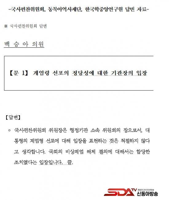 ¡à ´õºÒ¾î¹ÎÁÖ´ç ¹é½Â¾Æ ÀÇ¿ø(±³À°À§¿øÈ¸)Àº Áö³­ 5ÀÏ ±¹°¡ ¿ª»ç±â°üÀÎ ±¹»çÆíÂùÀ§¿øÈ¸, µ¿ºÏ¾Æ¿ª»çÀç´Ü, Çѱ¹ÇÐÁß¾Ó¿¬±¸¿ø¿¡ 12.3 °è¾ö·É ¼±Æ÷ÀÇ Á¤´ç¼º¿¡ ´ëÇÑ ±â°üÀåµéÀÇ ÀÔÀåÀ» ÁúÀÇÇßÀ¸¸ç, °¢ ±â°üÀ¸·ÎºÎÅÍ ´äº¯À» ¹Þ¾Ò´Ù.
