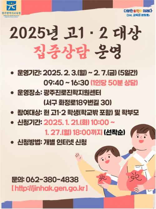»ó´ãÀ» Èñ¸ÁÇÏ´Â ÇлýÀº ¿À´Â 21ÀÏ ¿ÀÀü 10½ÃºÎÅÍ 27ÀÏ ¿ÀÈÄ 6½Ã±îÁö ±¤ÁÖÁø·ÎÁøÇÐÁö¿ø¼¾ÅÍ È¨ÆäÀÌÁö(https://jinhak.gen.go.kr)¿¡¼ ½ÅûÇÏ¸é µÈ´Ù.