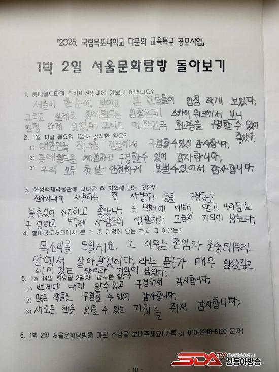 À̹ø 1¹Ú 2ÀÏ ¼¿ï¹®È޹æÀº ¸ñÆ÷ÇÏ´çÁßÇб³ ±³À°º¹Áö½Ç¿¡¼ ÁÖ°üÇÑ Çà»ç·Î ±¹¸³¸ñÆ÷´ëÇб³ ´Ù¹®È ±³À°Æ¯±¸ °ø¸ð»ç¾÷¿¡ ¼±Á¤µÇ¾î ¿¹»êÀ» Áö¿ø¹Þ¾Æ ¿î¿µµÈ ÇÁ·Î±×·¥ÀÌ´Ù.