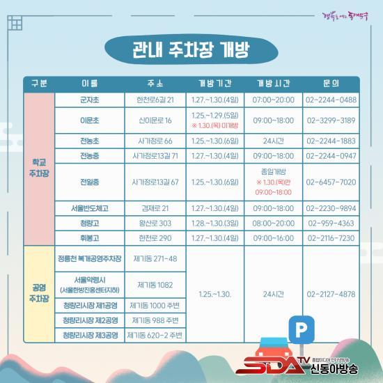 ¹æ¹®°´, ¿ª±Í¼º°´ µîÀÇ ÁÖÂ÷ ÆíÀǸ¦ À§ÇØ 25ÀϺÎÅÍ 30ÀϱîÁö 6Àϰ£ °ü³» Çб³ ¹× °ø¿µÁÖÂ÷Àå 13°³¼Ò¸¦ ¹«·á·Î Àӽð³¹æÇÑ´Ù. ÇØ´ç ÁÖÂ÷ÀåÀº ±ºÀÚÃʵîÇб³¸¦ Æ÷ÇÔÇÑ ÃÊ¡¤Áß¡¤°íµîÇб³ 8°³¼Ò¿Í Á¤¸ªÃµ º¹°³°ø¿µÁÖÂ÷Àå µî 5°³ °ø¿µÁÖÂ÷ÀåÀ¸·Î, ±¸ ´©¸®Áý ¶Ç´Â ÇàÁ¤¾ÈÀüºÎ¿¡¼ ¿î¿µÇÏ´Â °øÀ¯´©¸® »çÀÌÆ®¸¦ ÅëÇØ È®ÀÎÇÒ ¼ö ÀÖ´Ù.