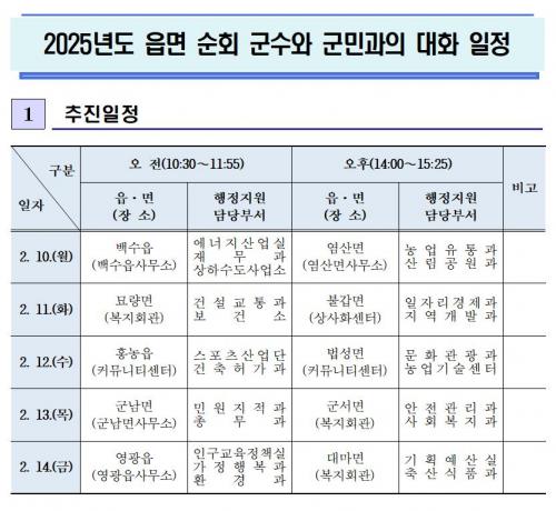¹Î¼±8±â 2025³â¡¸±º¼ö¿Í ±º¹Î°úÀÇ ´ëÈ¡¹´Â ¡ã2. 10.(¿ù) ¹é¼öÀ¾, ¿°»ê¸é ¡ã2. 11.(È) ¹¦·®¸é, ºÒ°©¸é ¡ã2. 12.(¼ö) È«³óÀ¾, ¹ý¼º¸é ¡ã2. 13.(¸ñ) ±º³²¸é, ±º¼¸é ¡ã2. 14.(±Ý) ¿µ±¤À¾, ´ë¸¶¸é ¼øÀ¸·Î ÁøÇàµÇ¸ç, µµ¼Áö¿ªÀÎ ³«¿ù¸é ±º¹Î°úÀÇ ´ëÈ´Â º°µµ ÀÏÁ¤À» Àâ¾Æ ÃßÁøÇÒ °èȹÀÌ´Ù.