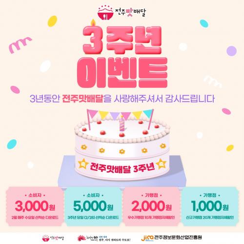 ¶ÇÇÑ ÀüÁÖ¸À¹è´ÞÀÇ ¼¼ ¹øÂ° »ýÀÏÀÎ ¿À´Â 2¿ù 28ÀÏ¿¡´Â °í°´ 1000¸í¿¡°Ô ¡®3Áֳ⠱â³ä ÇÒÀÎÄíÆù(5000¿ø)¡¯À» Áö±ÞÇϴ Ưº° À̺¥Æ®°¡ ÆîÃÄÁø´Ù. ÇØ´ç ÄíÆùÀº ´çÀÏ ¿ÀÀü 10½Ã ¼±Âø¼øÀ¸·Î ´Ù¿î·ÎµåÇÒ ¼ö ÀÖÀ¸¸ç, ¿À´Â 3¿ù 31ÀϱîÁö »ç¿ëÇÒ ¼ö ÀÖ´Ù.