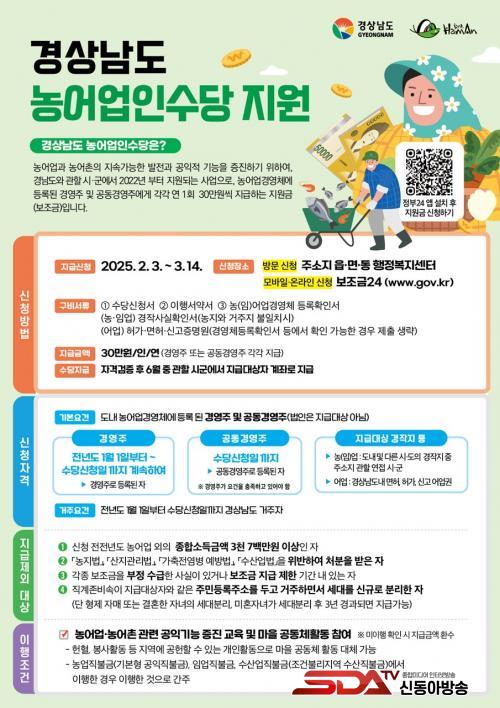 Áö±Þ ´ë»óÀÚ´Â 2024³â 1¿ù 1ÀϺÎÅÍ ¼ö´ç ½ÅûÀϱîÁö °æ»ó³²µµ¿¡ °ÅÁÖÇÏ¸é¼ ³ó¾î¾÷°æ¿µÃ¼¿¡ µî·ÏµÈ °æ¿µÁÖ¿Í °øµ¿°æ¿µÁÖÀ̸ç, °øµ¿°æ¿µÁÖ´Â ³ó¾î¾÷°æ¿µÃ¼¿¡ °æ¿µÁÖ ¿Ü ³ó¾÷ÀÎÀ¸·Î µîÀçµÈ °æ¿µÁÖÀÇ ¹è¿ìÀڷμ ¼ö´ç ½ÅûÀÏ(3¿ù 14ÀÏ)±îÁö °øµ¿°æ¿µÁÖ·Î µî·ÏÇÏ¸é µÈ´Ù.