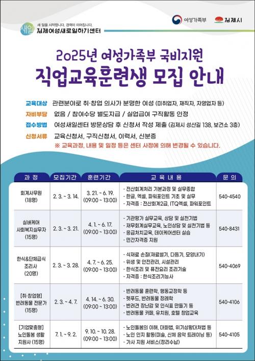 Á÷¾÷±³À°ÈÆ·ÃÀÇ Á¢¼ö ¹æ¹ýÀº ±èÁ¦¿©¼º»õ·ÎÀÏÇϱ⼾ÅÍ¿¡ ½ÅûÀÚ°¡ Á÷Á¢ ¹æ¹®ÇØ »ó´ã»çµé°ú »ó´ã ÈÄ¿¡ ÀûÇÕ ¿©ºÎ¿¡ µû¶ó ÃÖÁ¾ ½ÅûÁ¢¼ö°¡ °¡´ÉÇÏ´Ù. ¸ðÁýÀº Áö³ 3ÀϺÎÅÍ ½ÃÀÛÇØ Á¢¼ö ÁøÇà Áß¿¡ ÀÖÀ¸¸ç, 2¿ù ¸»¿¡¼ 3¿ù ÃʱîÁö ÁýÁß ¸ðÁýÀ» À§ÇØ Àû±Ø È«º¸ÇÒ ¿¹Á¤ÀÌ´Ù.