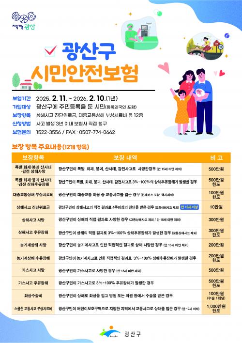º¸ÇèÀº ±¤»ê±¸¿¡ Áֹεî·ÏÀ» µÎ°í °ÅÁÖÇÏ´Â ¸ðµç ½Ã¹Î°ú ¿Ü±¹ÀÎ µî·ÏÀÚ¸¦ ´ë»óÀ¸·Î º°µµÀÇ °¡ÀÔ ÀýÂ÷ ¾øÀÌ ´©±¸³ª ÀÚµ¿À¸·Î °¡ÀÔµÇ¸ç »ç°íÀϷκÎÅÍ 3³â À̳» ½ÅûÇÏ¸é º¸Àå¹ÞÀ» ¼ö ÀÖ´Ù. °¡ÀÔ ±â°£Àº 2026³â 2¿ù 10ÀϱîÁö 1³âÀ̸ç, º¸ÇèÀº ¸Å³â °»½ÅÇÑ´Ù.