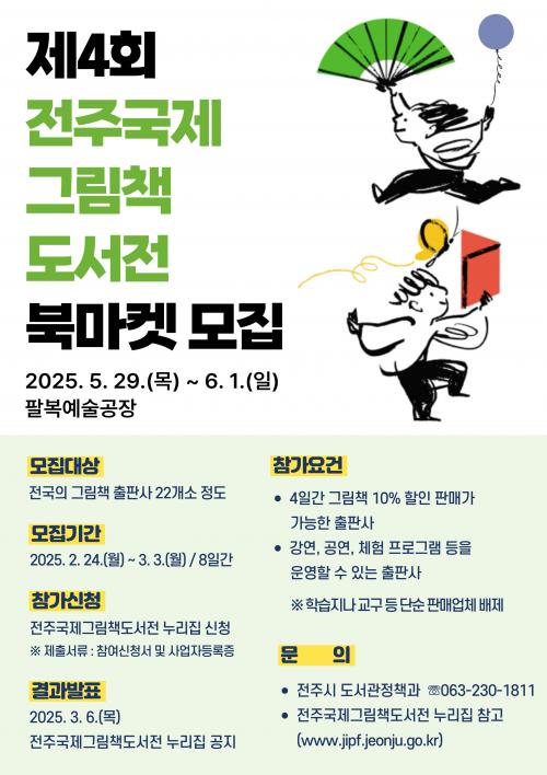 Âü¿©¸¦ Èñ¸ÁÇÏ´Â ÃâÆÇ»ç´Â ÀüÁÖ±¹Á¦±×¸²Ã¥µµ¼­Àü ´©¸®Áý(jipf.jeonju.go.kr)¿¡¼­ ³»·Á¹ÞÀº ½Åû¼­¸¦ ÀÛ¼ºÇØ »ç¾÷ÀÚµî·ÏÁõ »çº» µî ±¸ºñ¼­·ù¿Í ÇÔ²² ¿Â¶óÀÎÀ¸·Î Á¦ÃâÇÏ¸é µÈ´Ù. ±âŸ ÀÚ¼¼ÇÑ »çÇ×Àº ÀüÁÖ±¹Á¦±×¸²Ã¥µµ¼­Àü ´©¸®ÁýÀ» Âü°íÇϰųª, ÀüÈ­(063-230-1811)·Î ¹®ÀÇÇÏ¸é µÈ´Ù.