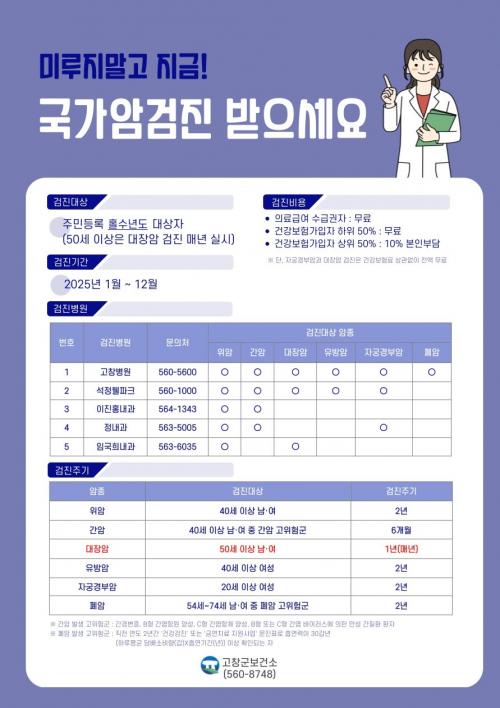 Ãâ»ý³âµµ¿Í »ó°ü¾øÀÌ °£¾Ï(40¼¼ ÀÌ»ó °íÀ§Ç豺)Àº 6°³¿ù¸¶´Ù, ´ëÀå¾Ï(50¼¼ ÀÌ»ó)Àº ¸Å³â °Ë»çÇÏ¸é µÈ´Ù.
