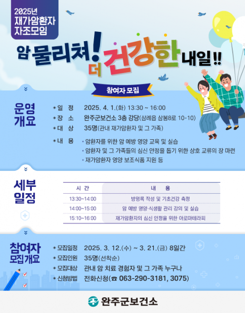 °ü³» ¾Ï Ä¡·á °æÇèÀÚ ¹× ±× °¡Á·µéÀº ´©±¸³ª Âü¿© °¡´ÉÇϸç, Èñ¸ÁÀÚ´Â ¿À´Â 21ÀϱîÁö ¿ÏÁÖ±ºº¸°Ç¼Ò(290-3075, 3181)·Î ½Åû Á¢¼öÇÏ¸é µÈ´Ù. Âü°¡ÀÚ´Â ¼±Âø¼øÀ¸·Î ¼±Á¤µÈ´Ù.