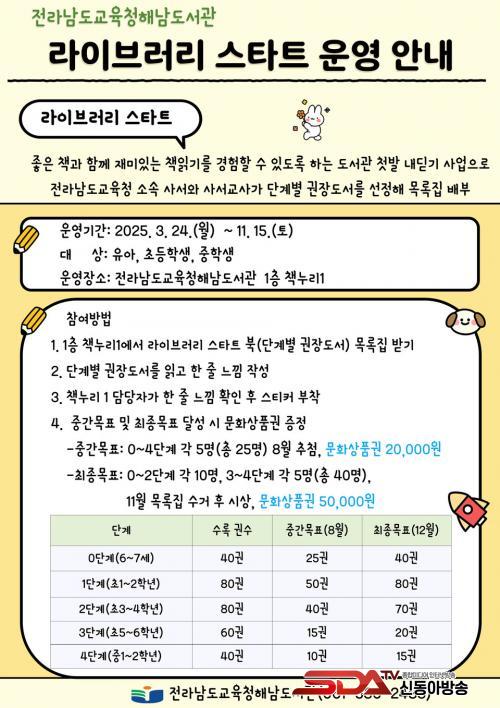 ¶óÀ̺귯¸® ½ºÅ¸Æ®¿¡ Âü¿©ÇÏ´Â ¹æ¹ýÀº Àü¶ó³²µµ±³À°Ã»Çس²µµ¼°üÀ» ¹æ¹®ÇÏ¿© ¶óÀ̺귯¸® ½ºÅ¸Æ®ºÏ(´Ü°èº° ±ÇÀåµµ¼ ¸ñ·ÏÁý)À» ¹Þ¾Æ ´Ü°èº° ±ÇÀåµµ¼¸¦ Àаí ÇÑ ÁÙ ´À³¦À» ÀÛ¼ºÇÑ ÈÄ, ÀÚ·á½Ç »ç¼¿¡°Ô È®ÀÎ ½ºÆ¼Ä¿¸¦ ¹ÞÀ¸¸é µÈ´Ù.