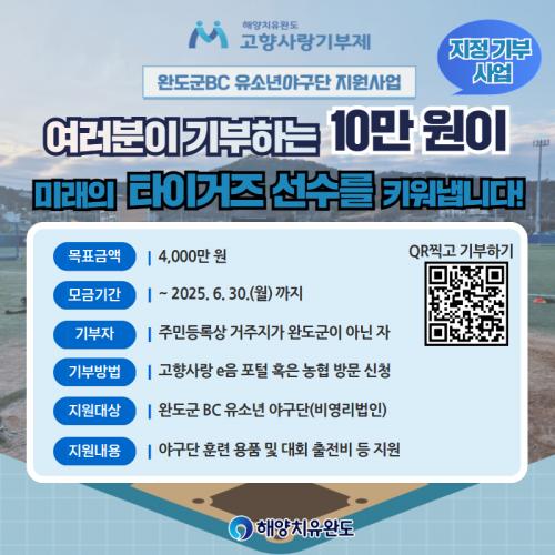 ÀÌ¿¡ 6¿ù ¸»±îÁö ¡¸¿Ïµµ±ºBC À¯¼Ò³â ¾ß±¸´Ü À°¼º Áö¿ø¡¹À» À§ÇØ ÁöÁ¤ ±âºÎ ¸ñÇ¥ ±Ý¾× 4õ¸¸ ¿øÀ» ¸ð±ÝÇϸç, ±âºÎ±ÝÀº ¾ß±¸ ²Þ³ª¹«µéÀÇ ÈÆ·Ã¿¡ ÇÊ¿äÇÑ °¢Á¾ Àåºñ ±¸ÀÔ, ´ëȸ Âü°¡ºñ µî¿¡ ¾²ÀÏ ¿¹Á¤ÀÌ´Ù.