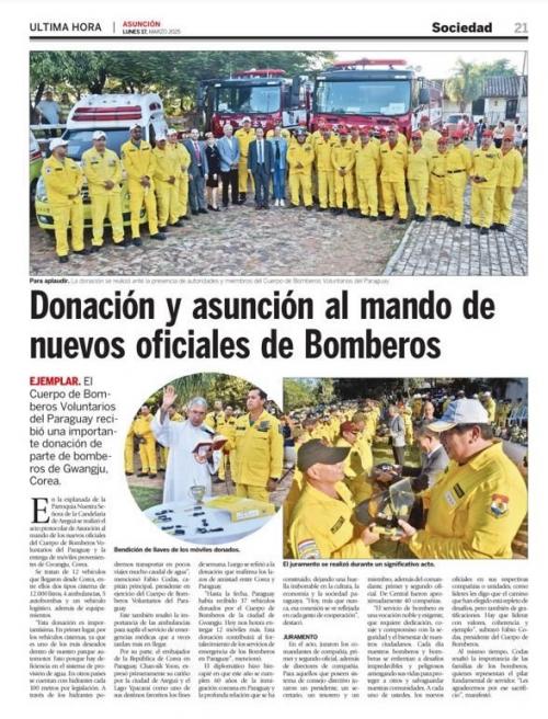 ¶Ç Áö³ 2018³âºÎÅÍ 2024³â±îÁö ³»¿ë¿¬¼ö°¡ °æ°úÇÑ ¼Ò¹æÂ÷·® 49´ë¸¦ ¹«»ó Áö¿øÇß´Ù. ¿ÃÇØ´Â ¼Ò¹æÂ÷·® 6´ë(ÆßÇÁÂ÷ 3´ë, ±¸±ÞÂ÷ 3´ë)¿Í ÇÔ²² ±¤ÁÖ¼Ò¹æ¾ÈÀüº»ºÎ ±³À°ÈƷôÜÀ» ÆÄ¶ó°úÀÌ ÇöÁö¿¡ ÆÄ°ß, ±¤ÁÖ¼Ò¹æÀÇ ¼±Áø ¼Ò¹æ±â¼úÀ» Àü¼öÇÏ´Â µî Æø³ÐÀº Áö¿øÀ» ÇÒ °èȹÀÌ´Ù.