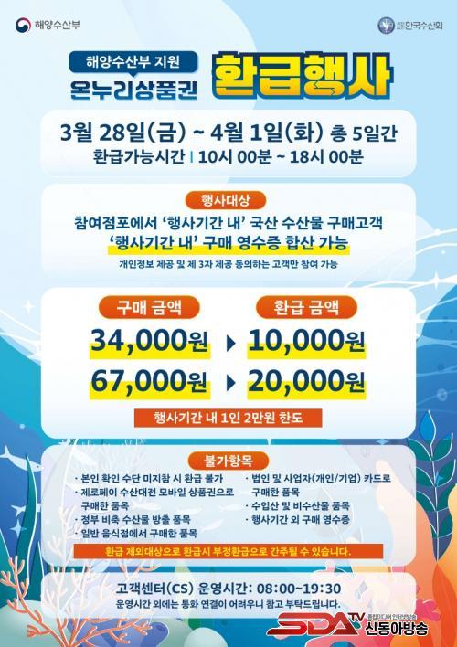 Çà»ç ±â°£ Áß ¿ÀÀ̵µÀüÅë¼ö»ê½ÃÀå ³» Âü¿© Á¡Æ÷¿¡¼ ±¹»ê ¼ö»ê¹°À» ±¸¸ÅÇÑ ½Ã¹ÎÀº ¿µ¼öÁõ°ú ½ÅºÐÁõ ȤÀº º»ÀÎ ¸íÀÇ ÈÞ´ëÀüȸ¦ ÁöÂüÇØ ȯ±Þ ⱸ¸¦ ¹æ¹®Çϸé, ±¸¸Å ±Ý¾×ÀÇ ÃÖ´ë 30%¸¦ ¿Â´©¸®»óǰ±ÇÀ¸·Î ȯ±Þ¹ÞÀ» ¼ö ÀÖ´Ù. ȯ±Þ °¡´É ½Ã°£Àº ¿ÀÀü 10½ÃºÎÅÍ ¿ÀÈÄ 6½Ã±îÁöÀ̸ç, 1Àδç ÃÖ´ë 2¸¸ ¿ø±îÁö ȯ±ÞÇÒ ¼ö ÀÖ´Ù.