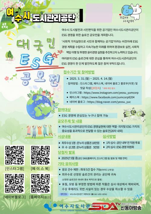 ´ÙÀ½´Þ 14ÀϱîÁö 2ÁÖ°£ ÁøÇàµÇ´Â À̹ø °ø¸ðÀüÀº ¿©¼ö½Ãµµ½Ã°ü¸®°ø´ÜÀÇ ESG °æ¿µ½ÇÇö¿¡ ´ëÇÑ ¿ªÇÒ¡¤ÀÇÁö ¹× ESG °¡Ä¡ÀÇ Á߿伺À» È¿°úÀûÀ¸·Î Àü´ÞÇÒ ¼ö ÀÖ´Â ½½·Î°ÇÀ» 20ÀÚ ³»¿Ü·Î ±â¼úÇØ °ø´Ü ÀνºÅ¸±×·¥, ÆäÀ̽ººÏÀ» ÆÈ·Î¿ìÇÏ°í ´ñ±ÛÀ» ´Þ°Å³ª, °ø´Ü ºí·Î±× [°ø°í¡¤¾Ë¸²] ¸Þ´º ³» ´ñ±ÛÀ» ´Þ¸é µÇ´Â Çü½ÄÀ¸·Î ¸Å¿ì °£ÆíÇÏ°Ô ÁøÇàµÉ ¿¹Á¤ÀÌ´Ù.