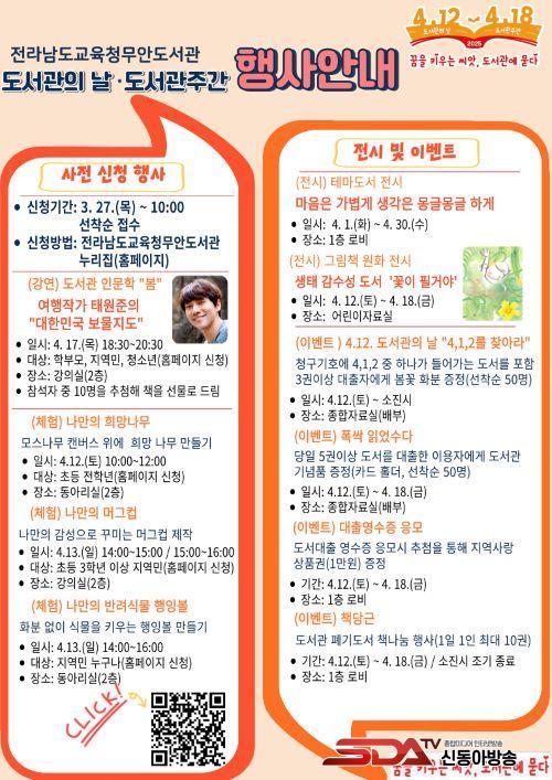 [½Åµ¿¾Æ¹æ¼Û Àü³²=À̽ŵ¿±âÀÚ] Àü¶ó³²µµ±³À°Ã»¹«¾Èµµ¼­°üÀº µµ¼­°üÀÇ ³¯ ¹× µµ¼­°üÁÖ°£À» ¸Â¾Æ 4¿ù 12ÀÏ(Åä)ºÎÅÍ 18(±Ý)±îÁö¡®²ÞÀ» Ű¿ì´Â ¾¾¾Ñ, µµ»ç°ü¿¡ ¹¯´Ù¡¯¸¦ ÁÖÁ¦·Î ´Ù¾çÇÑ µ¶¼­¹®È­ Çà»ç¸¦ ¿î¿µÇÑ´Ù.