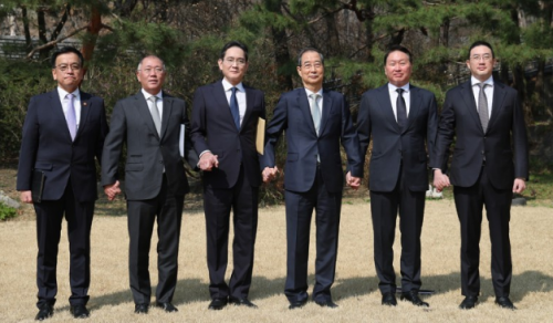 ÇÑ´ö¼ö ´ëÅë·É ±ÇÇÑ´ëÇà ±¹¹«ÃѸ®°¡ 1ÀÏ ¼­¿ï Á¾·Î±¸ »ïûµ¿ ÃѸ®°ø°ü¿¡¼­ ¿­¸° °æÁ¦¾Èº¸Àü·«TF ȸÀÇ¿¡ ¾Õ¼­ ±â³ä»çÁøÀ» ÃÔ¿µÇϰí ÀÖ´Ù. ¿ÞÂʺÎÅÍ ÃÖ»ó¸ñ ºÎÃѸ®, Á¤ÀǼ± Çö´ëÂ÷ ȸÀå, ÀÌÀç¿ë »ï¼ºÀüÀÚ È¸Àå, ÇÑÃѸ®, ÃÖÅ¿ø SK ȸÀå, ±¸±¤¸ð LG ȸÀå. (Ãâó : ´ëÅë·É½Ç»çÁø±âÀÚ´Ü)