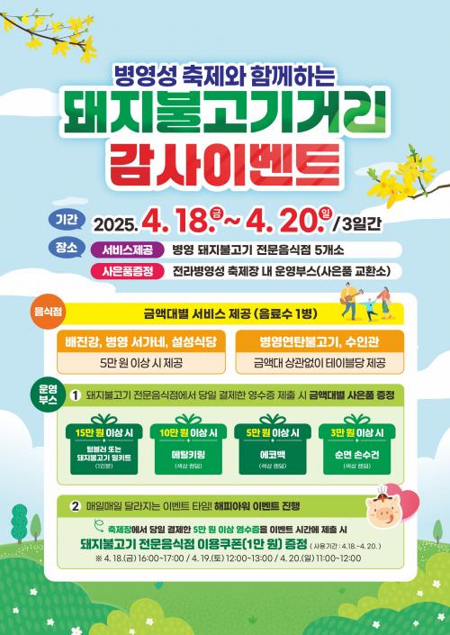 À̹ø Çà»ç´Â ´Ü¼øÇÑ ¸Ô°Å¸® Çà»ç¸¦ ³Ñ¾î Áö¿ª »ó±Ç°ú ÃàÁ¦°¡ ÇÔ²² »ó»ýÇÏ¸ç ´õ ¸¹Àº °ü±¤°´À» À¯Ä¡Çϱâ À§ÇØ ¸¶·ÃµÆ´Ù. º´¿µ µÅÁöºÒ°í±â°Å¸®ÀÇ ¿ì¼öÇÑ À½½ÄÀ» ¾Ë¸®°í º´¿µÀÇ ÀüÅë°ú Çö´ë°¡ ¾î¿ì·¯Áø Ưº°ÇÑ °æÇèÀ» Á¦°øÇϰí, °­ÁøÀÇ ¸Å·ÂÀ» ¾Ë¸°´Ù.
