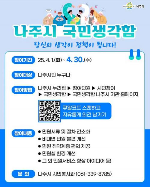 ³ªÁÖ½Ã(½ÃÀå À±º´ÅÂ)´Â ±¹¹Î±ÇÀÍÀ§¿øÈ¸¿¡¼­ ¿î¿µÇÏ´Â ¡®±¹¹Î»ý°¢ÇÔ¡¯À» ÅëÇØ ¿À´Â 4¿ù 30ÀϱîÁö ¹Î¿ø ¼­ºñ½º °³¼±°ú °ü·ÃÇÑ ½Ã¹Î ÀǰßÀ» ¿Â¶óÀÎÀ¸·Î Á¢¼öÇÑ´Ù°í 7ÀÏ ¹àÇû´Ù.
