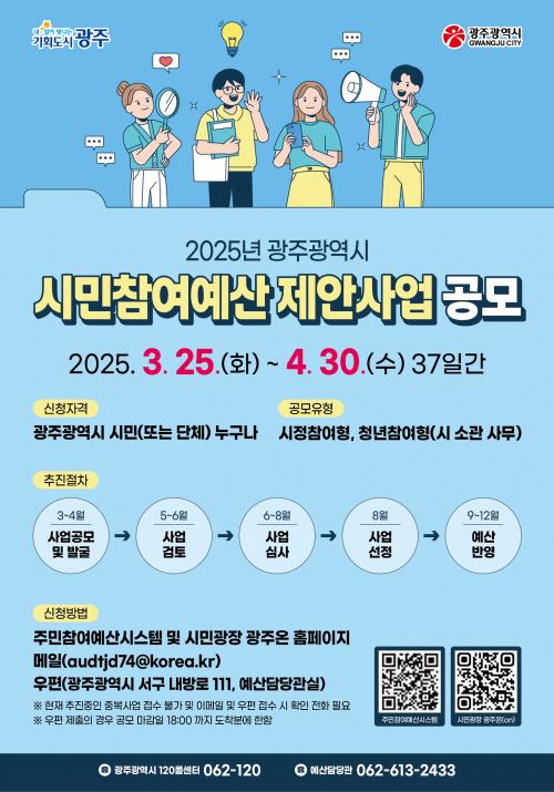 Âü¿©´Â ±¤Áֽà ´©¸®Áý(°í½Ã‧°ø°í)¿¡¼­ ½Åû¼­¸¦ ³»·Á¹Þ¾Æ ¡®±¤Áֽà ÁÖ¹ÎeÂü¿©½Ã½ºÅÛ¡¯(https://pb.lofin365.go.kr/gwangju/business/regBusinessInfoView2)°ú ¡®½Ã¹Î±¤Àå ±¤ÁÖ¿Â(ON)¡¯(https://gwangjuon.gwangju.go.kr)À» ÅëÇØ ¿Â¶óÀÎ Á¢¼öÇÏ¸é µÈ´Ù. ¸ÞÀÏ(audtjd74@korea.kr)À̳ª ¿ìÆí(±¤ÁÖ ¼­±¸ ³»¹æ·Î111, ±¤Áֽà ¿¹»ê´ã´ç°ü½Ç)À¸·Îµµ Á¢¼öÇÒ ¼ö ÀÖ´Ù.