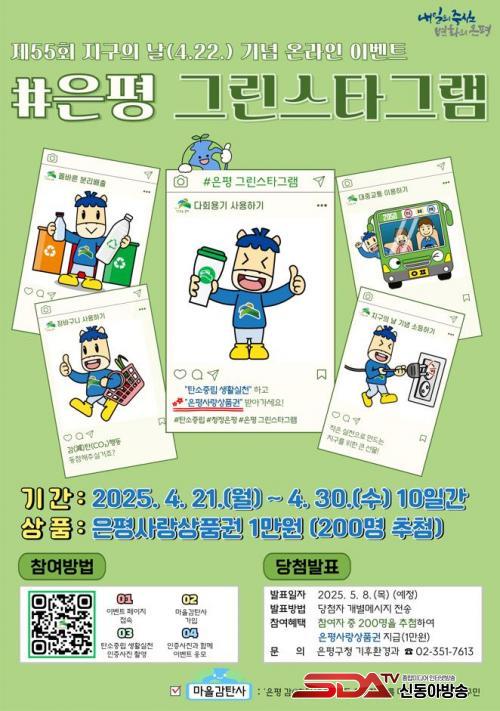 [½Åµ¿¾Æ¹æ¼Û ÀºÆò±¸=À̽ŵ¿±âÀÚ] ¼­¿ï ÀºÆò±¸´Â 4¿ù 22ÀÏÀÎ Á¦55ȸ Áö±¸ÀÇ ³¯À» ±â³äÇØ ¡®#ÀºÆò ±×¸°½ºÅ¸±×·¥¡¯ ¿Â¶óÀÎ À̺¥Æ®¸¦ ¿À´Â 21ÀϺÎÅÍ 30ÀϱîÁö ÃÑ 10Àϰ£ °³ÃÖÇÑ´Ù°í ¹àÇû´Ù.