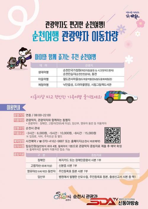 ¡®¼øÃµ¿©Çà °ü±¤¾àÀÚ À̵¿Â÷·®¡¯Àº ÈÙü¾î¼® 1ÀÎ, ÀϹݼ® ÃÖ´ë 4ÀαîÁö ž½Â °¡´ÉÇϸç, ÄÚ½º´Â ¸ÂÃãÇüÀ¸·Î Á¦°øÇÑ´Ù. ÀÌ¿ë¿ä±ÝÀº 3½Ã°£¿¡ 6õ ¿ø, 5½Ã°£¿¡ 1¸¸ ¿ø, 8½Ã°£¿¡ 1¸¸ 5õ ¿øÀÌ´Ù. ¼øÃµ½Ã ¹Ù·Î¿¹¾à ´©¸®Áý ¶Ç´Â ÀüÈ(070-4162-9887)¸¦ ÅëÇØ ¿¹¾àÇÒ ¼ö ÀÖ´Ù.