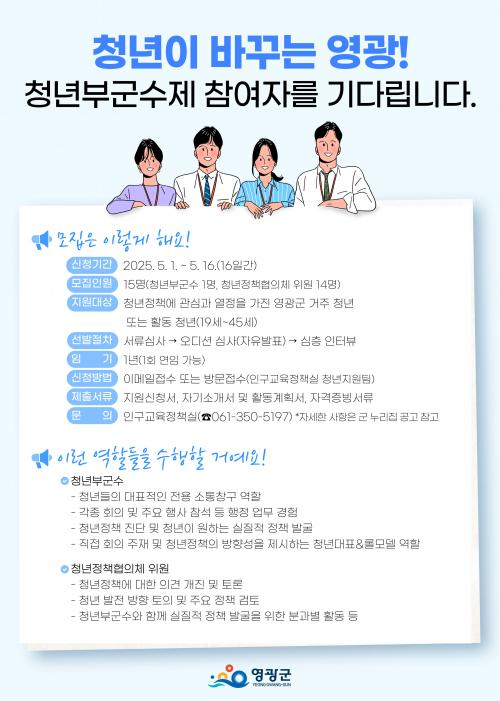 ¸ðÁý ºÐ¾ß´Â ¡ãû³â ºÎ±º¼ö 1¸í ¡ãû³âÁ¤Ã¥À§¿ø 14¸íÀ¸·Î, ¸¸ 19¼¼ºÎÅÍ 45¼¼ ÀÌÇÏÀÇ ¿µ±¤±º °ÅÁÖÀÚ ¶Ç´Â °ü³»¿¡¼­ Ȱµ¿ ÁßÀΠû³âÀÌ¸é ´©±¸³ª Áö¿øÇÒ ¼ö ÀÖ´Ù. ¸ðÁý ¸¶°¨Àº ¿À´Â 5¿ù 16ÀϱîÁö´Ù.