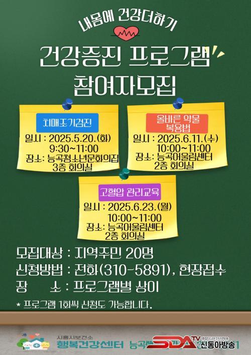 °¢ °Á´ ¼±Âø¼øÀ¸·Î 20¸í¾¿ ¸ðÁýÇϸç, Áö¿ªÁÖ¹ÎÀÇ Áúȯ ¿¹¹æ°ú °Ç°°ü¸® ´É·ÂÀ» Çâ»óÇÏ´Â ³»¿ëÀ¸·Î ±¸¼ºµÆ´Ù. 1Â÷ ±³À°(5¿ù 20ÀÏ ¿ÀÀü 9½Ã 30ºÐ~11½Ã, ´É°îû¼Ò³â¹®ÈÀÇÁý 3Ãþ ȸÀǽÇ)Àº 60¼¼ ÀÌ»ó Áö¿ªÁÖ¹ÎÀ» ´ë»óÀ¸·Î Ä¡¸Å Á¶±â°ËÁøÀ» ÁøÇàÇØ ¿¹¹æÀ» ÅëÇØ °Ç°ÇÑ ³ë³âÀ» ÁغñÇÒ ±âȸ¸¦ Á¦°øÇÑ´Ù.