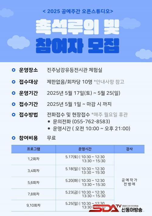 [½Åµ¿¾Æ¹æ¼Û °æ³²ÁøÁÖ=³²±Ã¿µ±â±âÀÚ] ÁøÁֽô 2025³â °ø¿¹ÁÖ°£ ¿ÀǽºÆ©µð¿À ¡¸ÁøÁÖ, °ø¿¹ÀÇ °áÀ» µû¶ó °È´Ù¡¹¸¦ ¸ÂÀÌÇØ ÁøÁÖ³²°­À¯µîÀü½Ã°ü¿¡¼­ <Ã˼®·çÀÇ ºû> ÇÁ·Î±×·¥ Âü¿©ÀÚ¸¦ ¸ðÁýÇÑ´Ù°í ¹àÇû´Ù.
