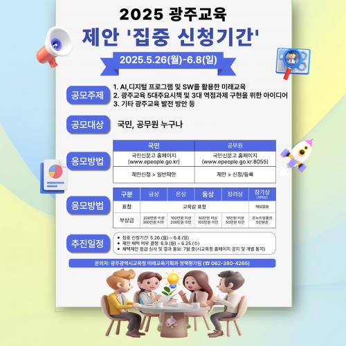 °ø¸ð ÁÖÁ¦´Â ¡ãAI‧µðÁöÅÐ ÇÁ·Î±×·¥ ¹× ¼ÒÇÁÆ®¿þ¾î(SW)¸¦ Ȱ¿ëÇÑ ¹Ì·¡±³À° ¹æ¾È ¡ã±¤ÁÖ±³À° 5´ë ÁÖ¿ä½ÃÃ¥(´Ù¾ç¼º±³À°, Ã¥ÀÓ±³À°, °øÁ¤±³À°, ¹Ì·¡±³À°, »ó»ý±³À°) ¹× 3´ë ¿ªÁ¡°úÁ¦(´Ù¾ç¼ºÀ» ǰÀº ½Ç·ÂÇâ»ó, ¹Ì·¡·Î °¡´Â AI±³À°, ¸ðµÎ°¡ µ¿ÇàÇÏ´Â ½Ã¹ÎÇùÄ¡) ±¸ÇöÀ» À§ÇÑ ¾ÆÀ̵ð¾î ¡ã±âŸ ±¤ÁÖ±³À° ¹ßÀü ¹æ¾È µî 3°³´Ù. 3°³ ÁÖÁ¦´Â Áö³ 16~22ÀÏ º»Ã»À» ºñ·ÔÇØ ±³À°Áö¿øÃ», Á÷¼Ó±â°üÀ» ´ë»óÀ¸·Î Á¦¾È Èñ¸Á°úÁ¦ ¼ö¿äÁ¶»ç¸¦ ½Ç½ÃÇØ ¼±Á¤Çß´Ù.