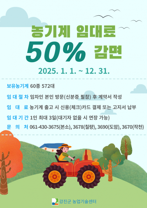 °¨¸é ´ë»óÀº °Áø±º °ü³»¿¡¼ ³ó°æÁö¸¦ °æÀÛÇÏ´Â ¸ðµç ³ó¾÷ÀÎÀÌ¸ç °ü¸®±â, Àï±â, ³ó¾÷¿ë ±¼Âø±â µî 60Á¾ 572´ëÀÇ ³ó±â°è¸¦ °¨¸éµÈ ÀÓ´ë·á·Î ÀÌ¿ëÇÒ ¼ö ÀÖ¾î ³ó°¡ÀÇ ½ÇÁúÀûÀÎ ¿µ³óºñ Àý°¨¿¡ Å©°Ô ±â¿©Çϰí ÀÖ´Ù.