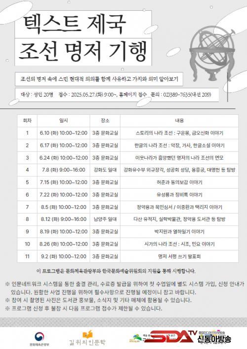±¸´Â ¹®ÈüÀ°°ü±¤ºÎ°¡ ÁÖÃÖÇÏ°í ¹®È¿¹¼úÀ§¿øÈ¸°¡ ÁÖ°üÇÏ´Â ¡®2025³â ±æ À§ÀÇ Àι®ÇС¯ °ø¸ð»ç¾÷¿¡ ¼±Á¤µÅ À̹ø ÇÁ·Î±×·¥À» ±âȹÇß´Ù. ¡®ÅؽºÆ® Á¦±¹, Á¶¼± ¸íÀú ±âÇ࡯Àº Á¶¼±½Ã´ë ¹®Çаú ¸íÀú¸¦ ÁÖÁ¦·Î ¿ª»ç, ½Ã, ¹®ÇÐ µî Àι®ÇÐÀû ޱ¸¸¦ ÇÏ´Â ÇÁ·Î±×·¥ÀÌ´Ù.