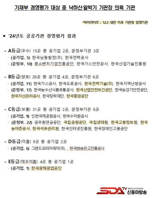 ÀÌ¿Í À¯»çÇÑ ¹®Á¦´Â 24³âµµ °¨»ç Á÷¹«¼öÇà½ÇÀû Æò°¡ °á°ú¿¡¼­µµ ¹Ýº¹µÆ´Ù. Aµî±ÞÀ» ¹ÞÀº ±â°üÀº Çѱ¹³²µ¿¹ßÀü, Çѱ¹Áö¿ª³­¹æ°ø»ç, ±â¼úº¸Áõ±â±Ý, Çѱ¹°¡½º¾ÈÀü°ø»ç µî 4°÷À̸ç, Bµî±ÞÀ» ¹ÞÀº ±â°üÀº ÃÑ 30°÷¿¡ ´ÞÇÑ´Ù. À̵é Áß¿¡´Â ¿¡½º¾Ë(SR), Çѱ¹µµ·Î°ø»ç, °Ç°­º¸Çè½É»çÆò°¡¿ø, Çѱ¹ÁÖÅñÝÀ¶°ø»ç µî ÁÖ¿ä °ø°ø±â°üÀÌ Æ÷ÇԵǾî ÀÖÀ¸¸ç, »óÀÓ°¨»ç ¿ª½Ã ³«ÇÏ»ê ÀÎ»ç ³í¶õÀÇ Á߽ɿ¡ ÀÖ¾ú´ø Àι°µéÀÌ ´Ù¼ö Á¸ÀçÇÑ´Ù.