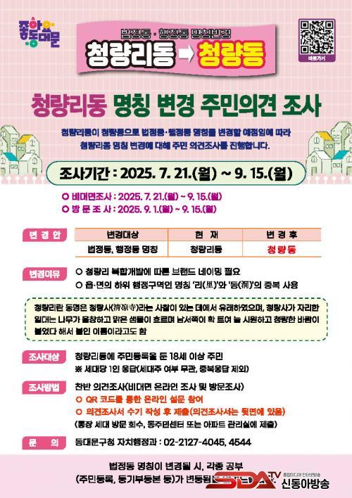 À̹ø Á¶»ç´Â û·®¸® º¹ÇÕ°³¹ß·Î ÀÎÇØ º¯ÈµÈ Áö¿ª Çö½ÇÀ» ¹Ý¿µÇÏ¿© µ¿ ¸íĪÀ» º¸´Ù °£°áÇÏ°í »ó¡¼º ÀÖ´Â ¡®Ã»·®µ¿¡¯À¸·Î º¯°æÇÏÀÚ´Â ÁֹεéÀÇ Áö¼ÓÀûÀÎ ¿äû¿¡ µû¶ó ÃßÁøµÇ´Â °ÍÀÌ´Ù.
