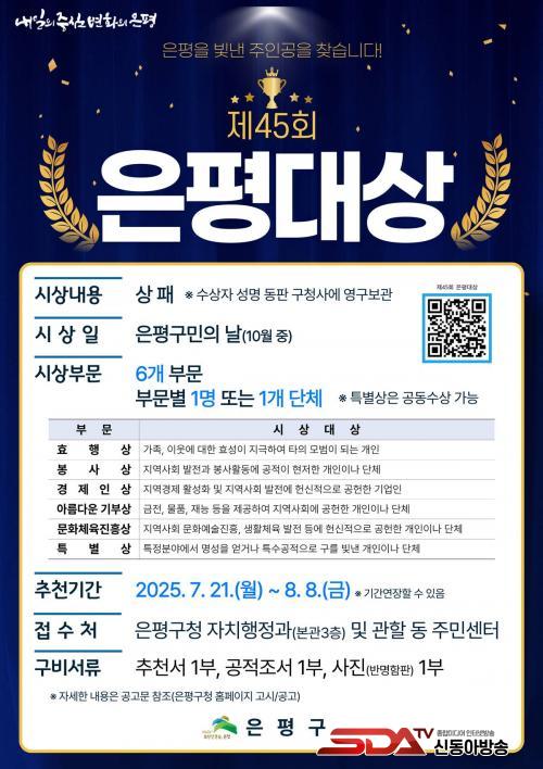 ÀºÆò±¸´Â Èĺ¸ÀÚ¸¦ ´ë»óÀ¸·Î °øÀû½É»çÀ§¿øÈ¸¸¦ °ÅÃÄ ¼ö»óÀÚ¸¦ ÃÖÁ¾ ¼±Á¤ÇØ 10¿ù¿¡ °³ÃֵǴ ÀºÆò±¸¹ÎÀÇ ³¯¿¡¼ ½Ã»óÇÒ °èȹÀ̸ç, ¼ö»óÀÚÀÇ ¼º¸íÀ» »õ±ä µ¿ÆÇÀ» ÀºÆòȦ ¸í¿¹ÀÇ Àü´ç¿¡ Çå¾×ÇÒ ¿¹Á¤ÀÌ´Ù.