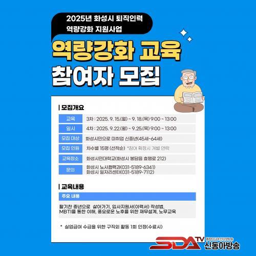 À̹ø ±³À°Àº ½Ç¾÷±Þ¿© ¼ö±ÞÀÚ¸¦ À§ÇÑ ±¸Á÷Ȱµ¿ 1ȸ·Îµµ ÀÎÁ¤µÈ´Ù. ±³À°°ú °ü·ÃÇÑ ÀÚ¼¼ÇÑ »çÇ×Àº È­¼º½Ã ³ë»çÇù·Â°ú(031-5189-6341) ¶Ç´Â È­¼º½Ã ÀÏÀÚ¸®¼¾ÅÍ(031-5189-7112)·Î ¹®ÀÇÇÏ¸é µÈ´Ù.