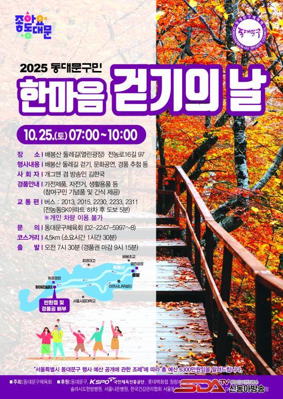 [½Åµ¿¾Æ¹æ¼Û µ¿´ë¹®±¸=À̽ŵ¿±âÀÚ] ¼­¿ï µ¿´ë¹®±¸´Â ±¸¹Î ¸ðµÎ°¡ ÇÔ²² °È°í ¿ôÀ¸¸ç °Ç°­À» ì±æ ¼ö Àִ¡¸2025³â ÇϹݱ⠵¿´ë¹®±¸¹Î ÇѸ¶À½ °È±âÀÇ ³¯¡¹À» ¿À´Â 10¿ù 25ÀÏ(Åä) ¿ÀÀü 7½Ã, ¹èºÀ»ê µÑ·¹±æ¿¡¼­ °³ÃÖÇÑ´Ù°í ¹àÇû´Ù.