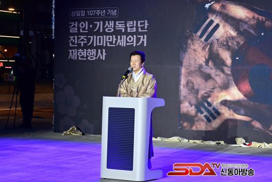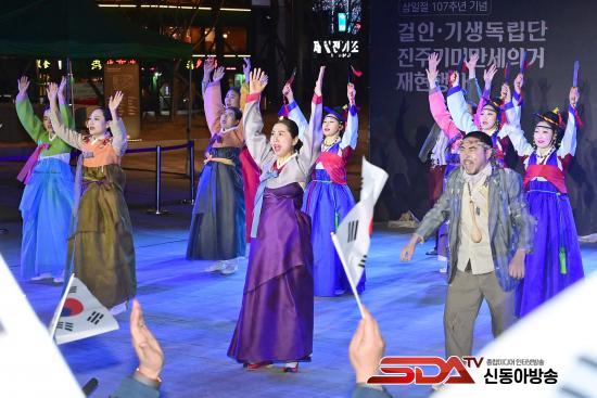[½Åµ¿¾Æ¹æ¼Û °æ³²ÁøÁÖ=±è¸í¼ö±âÀÚ] 3.1¿îµ¿ 107ÁÖ³âÀ» ±â³äÇØ Áö³­ 13ÀÏ ¿ÀÈÄ 6½Ã 30ºÐ ÁøÁÖ´ëø ¿ª»ç°ø¿ø È£±¹¸¶·ç¿¡¼­ ¡®ÁøÁÖ°ÉÀΡ¤±â»ýµ¶¸³´Ü ¸¸¼¼¿îµ¿¡¯ ÀçÇö Çà»ç°¡ ¿­·È´Ù.