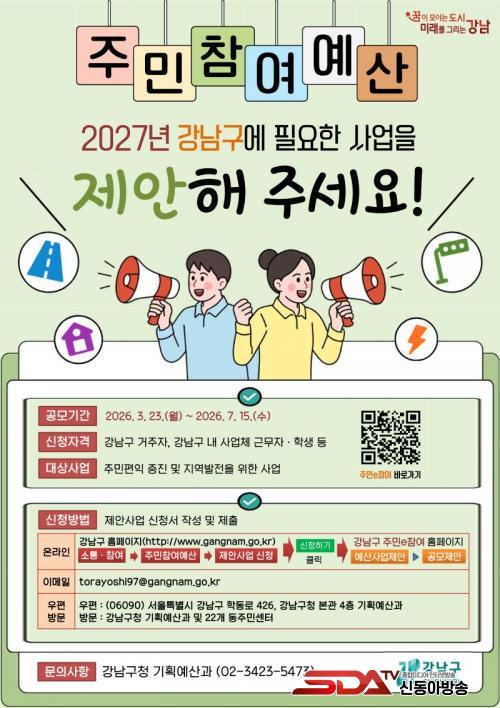 À̹ø °ø¸ð´Â ÁֹΠÆíÀÍ ÁõÁø°ú Áö¿ª ¹ßÀü¿¡ ±â¿©ÇÒ ¼ö ÀÖ´Â »ç¾÷À̸é Á¦¾ÈÇÒ ¼ö ÀÖ´Ù. Á¢¼öµÈ »ç¾÷Àº ¼Ò°ü ºÎ¼ °ËÅä¿Í °³²±¸ ÁÖ¹ÎÂü¿©¿¹»êÀ§¿øÈ¸ ½ÉÀǸ¦ °ÅÃÄ 2027³â ¿¹»ê¾È¿¡ ¹Ý¿µµÇ¸ç, ÀÌÈÄ ±¸ÀÇȸ ½ÉÀǸ¦ ÅëÇØ ÃÖÁ¾ È®Á¤µÈ´Ù. Âü¿© ´ë»óÀº °³²±¸¹Î»Ó ¾Æ´Ï¶ó °ü³» »ç¾÷ü ÀÓÁ÷¿ø, Çлý µîÀ¸·Î Æø³Ð°Ô ¿¾îµ×´Ù. ½ÅûÀº ±¸Ã» ȨÆäÀÌÁö¸¦ ÅëÇÑ ¿Â¶óÀÎ Á¢¼ö¿Í ¹æ¹®, ¿ìÆí Á¢¼ö·Î °¡´ÉÇÏ´Ù.