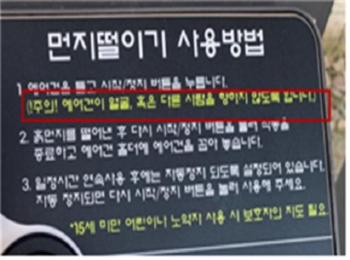 Á¶»ç´ë»ó 30°³¼Ò Áß 2°³¼Ò(6.7%)¿¡´Â °ø±âºÐ»ç±â »ç¿ë¹ýÀ» ¾È³»ÇÏ´Â ¾È³»¹®ÀÌ ¼³Ä¡µÇ¾î ÀÖÁö ¾Ê¾Ò°í, ¾È³»¹®ÀÌ ¼³Ä¡µÈ 28°³¼Ò Áß 7°³¼Ò(25.0%)¿¡´Â ¾î¸°ÀÌ »ç¿ë ½ÃÀÇ ÁÖÀÇ»çÇ×À̳ª µ¿¹ÝÇÑ º¸È£ÀÚÀÇ ÁÖÀǸ¦ ´çºÎÇÏ´Â ³»¿ëÀÌ ¾ø°Å³ª ¹ÌÈíÇß´Ù.