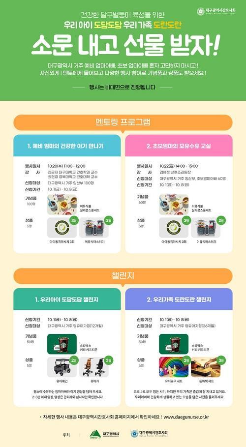 [½Åµ¿¾Æ¹æ¼Û´º½º=Â÷¼­À± ±âÀÚ] ´ë±¸½Ã´Â ´ë±¸½Ã°£È£»çȸ¿Í °Ç°­ÇÑ ´Þ±¸¹úµÕÀÌ À°¼ºÀ» À§ÇØ ¡®¿ì¸®¾ÆÀÌ µµ´ãµµ´ã ¿ì¸®°¡Á· µµ¶õµµ¶õ¡¯À̶ó´Â ½½·Î°ÇÀ¸·Î ¿À´Â 10¿ù 1ÀϺÎÅÍ ºñ´ë¸é Çà»ç¸¦ °³ÃÖÇÕ´Ï´Ù. À̹ø Çà»ç´Â ÀÓ»êºÎ ¹× ¿µÀ¯¾Æ °¡Á¤¿¡¼­ ÀӽŰú Ãâ»ê, À°¾Æ °ü·Ã¡¦