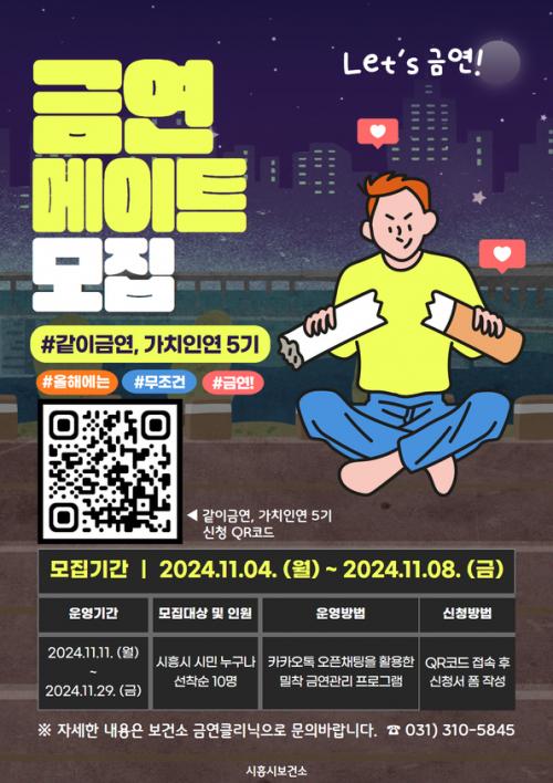 [½Åµ¿¾Æ¹æ¼Û ½ÃÈï½Ã=À̽ŵ¿±âÀÚ] ½ÃÈï½Ã´Â Èí¿¬ÀÚµéÀÇ ±Ý¿¬ ¼º°øÀ» µ½±â À§ÇÑ ºñ´ë¸é ±Ý¿¬ ÇÁ·Î±×·¥ÀÎ ¡®°°ÀÌ ±Ý¿¬, °¡Ä¡Àο¬¡¯À» 11¿ù 11ÀϺÎÅÍ 29ÀϱîÁö ¿î¿µÇÑ´Ù. ¡®°°ÀÌ ±Ý¿¬, °¡Ä¡Àο¬¡¯Àº ±Ý¿¬ Ŭ¸®´Ð µî·Ï ÈÄ Á÷Àå»ýȰÀ̳ª °³ÀÎ ÀÏÁ¤ µîÀÇ ÀÌÀ¯·Î ±Ý¿¬ Ŭ¸®´Ð¡¦