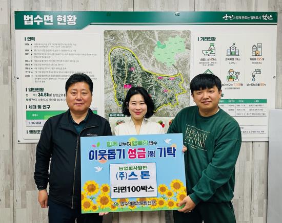 [½Åµ¿¾Æ¹æ¼Û °æ³²ÇÔ¾È=À̽ŵ¿±âÀÚ] ÇԾȱº ¹ý¼ö¸éÀº ³ó¾÷ȸ»ç¹ýÀÎ ÁÖ½Äȸ»ç ½ºÅæ¿¡¼­ ¹ý¼ö¸é»ç¹«¼Ò¸¦ ¹æ¹®ÇØ ¶ó¸é 100¹Ú½º(100¸¸ ¿ø »ó´ç)¸¦ ±âŹÇß´Ù°í 19ÀÏ ¹àÇû´Ù. ¾ç¿¹³ª ÁÖ½Äȸ»ç ½ºÅæ ´ëÇ¥´Â ¡°ÀÛÀº ³ª´®ÀÌÁö¸¸ Ãß¿öÁø ³¯¾¾¿¡ µµ¿òÀÌ ÇÊ¿äÇÑ ÀÌ¿ôµé¿¡°Ô µû¶æ¡¦