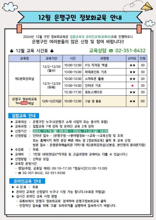 [½Åµ¿¾Æ¹æ¼Û ÀºÆò±¸=À̽ŵ¿±âÀÚ] ÀºÆò±¸´Â ¿ÃÇØ ¸¶Áö¸· ¡®ÀºÆò±¸¹Î Á¤º¸È­±³À°¡¯ ½ÅûÀÚ¸¦ ¿À´Â 22ÀϱîÁö ¸ðÁýÇÑ´Ù°í ¹àÇû´Ù. À̹ø ±¸¹Î Á¤º¸È­±³À°Àº ÁýÇÕ ±³À° 5°³ °­ÁÂ¿Í ¿Â¶óÀÎ ±³À° 1°³ °­Á·ΠÁøÇàµÈ´Ù. ±³À° ³»¿ëÀº ITQ ÀÚ°ÝÁõ ¿¢¼¿, ÆÄ¿öÆ÷ÀÎÆ® ±âÃÊ, ½º¸¶Æ®¡¦