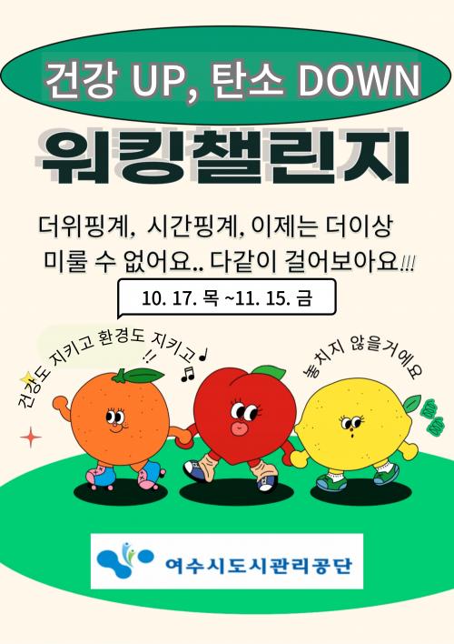 [½Åµ¿¾Æ¹æ¼ÛÀü³²¿©¼ö=±è±â³² ±âÀÚ] ¿©¼ö½Ãµµ½Ã°ü¸®°ø´Ü(ÀÌ»çÀå ±èÀ¯È­)Àº Áö³­ 10¿ù 17ÀϺÎÅÍ 11¿ù 15ÀϱîÁö 'Á÷¿ø ¿öÅ· 縰Áö'¸¦ ÃßÁøÇÏ¿´´Ù°í ¹àÇû´Ù. ±Ý¹ø Çà»ç´Â °Ç°­ÇÑ Á÷Àå ¹®È­¸¦ Á¶¼ºÇϰí, Á÷¿øµéÀÇ Ã¼·Â ÁõÁøÀ» À¯µµÇÏ´Â ÇÑÆí, ź¼Ò ¹ß»ý °¨ÃàÀÇ ÀÏȯÀ¸·Î¡¦